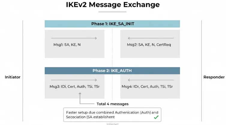 IKEv2 uses a highly streamlined four-message exchange to establish the connection, significantly reducing the overhead and latency compared to the nine messages required by IKEv1. This efficiency translates directly into faster connection times and better overall throughput, making the user experience smoother and less noticeable.