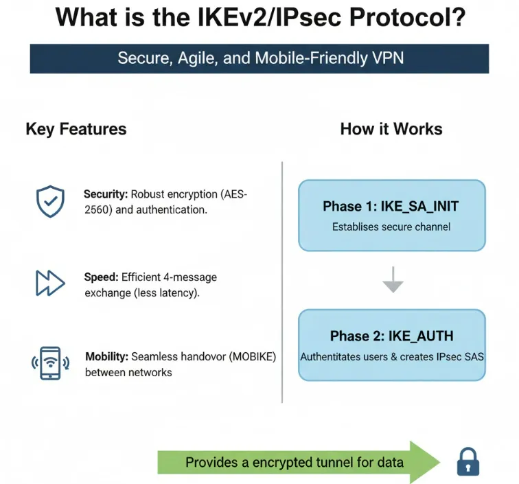 The IKEv2/IPsec protocol suite is the modern standard for establishing secure VPN (Virtual Private Network) connections. It is a fusion of two distinct, yet dependent, protocols: Internet Key Exchange version 2 (IKEv2) and Internet Protocol Security (IPsec).