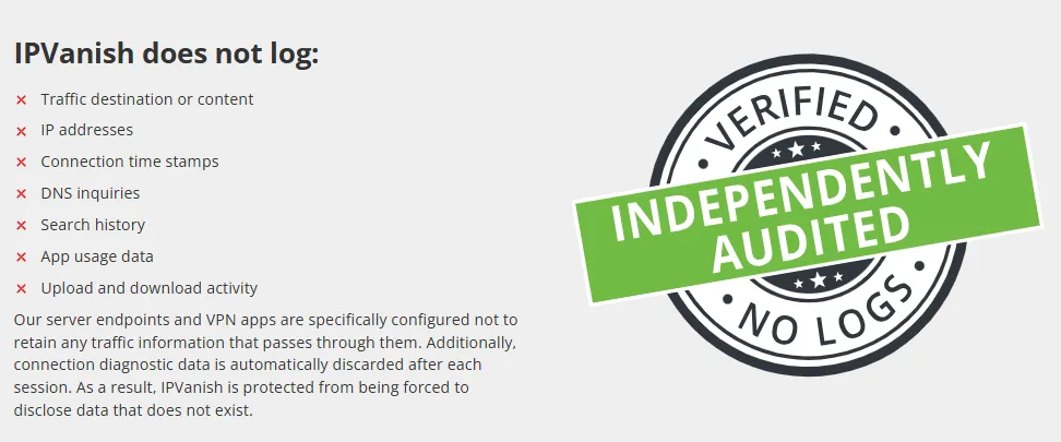 Independent Audit Proof: IPVanish's privacy practices were reviewed by the independent third-party firm Leviathan Security Group in March 2022. The audit results confirmed that IPVanish is fully compliant with its no-logs policy.