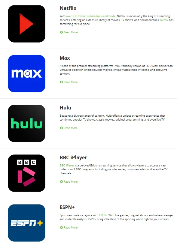 Stable, high-speed access to major US services like Netflix, Hulu, Max (HBO), and Disney+. |