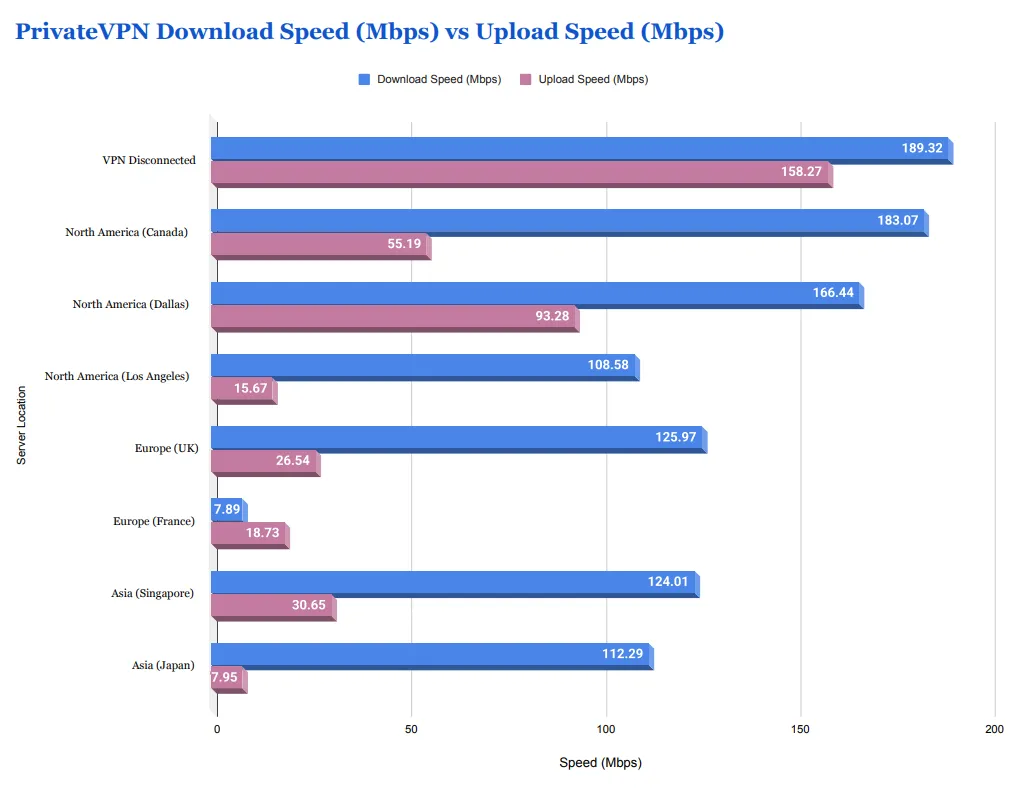 Upload Speed Flaws: For users who need to upload content quickly (e.g., videos or large files), PrivateVPN's performance is underwhelming. Upload speeds dropped dramatically on nodes like Los Angeles, Japan, and Australia, significantly hindering upload-heavy tasks.