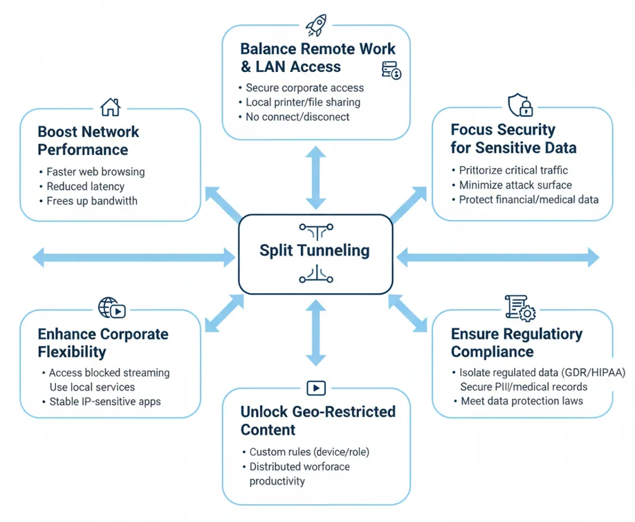 Split tunneling can significantly enhance the user experience by prioritizing efficiency where maximum security is not required.
