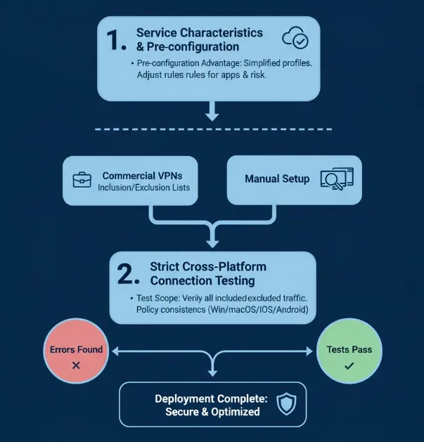 Once configured, the split tunneling rules must undergo comprehensive, cross-platform connection testing on all target devices.