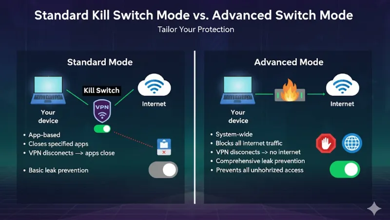Select the Right Stance: Align the mode with your risk tolerance. If you demand maximum privacy and can tolerate losing internet access when disconnected, decisively select the Advanced/Permanent Kill Switch. If you require the flexibility for occasional disconnection, choose the Standard mode.