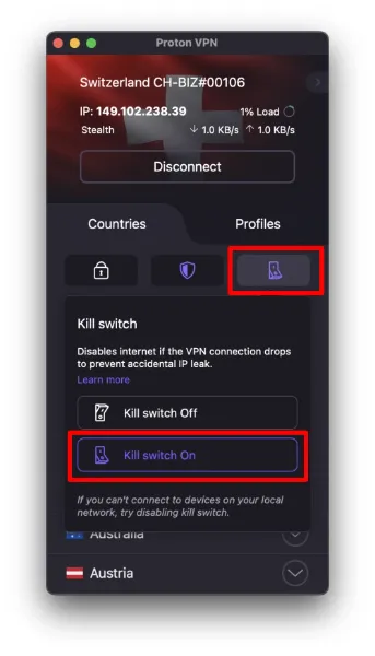 Note:Due to specific limitations within Apple’s operating systems, the Kill Switch may not block certain existing connections, specifically some DNS queries originating from Apple services, even when the Kill Switch is active. The feature will, however, reliably block all non-Apple connections.