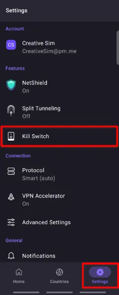 Open your VPN application and navigate to the "Settings" or "Connection/Features" menu from the main dashboard.