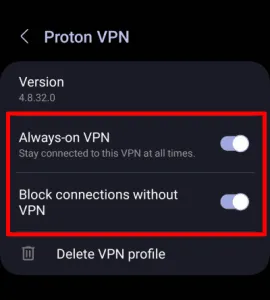 Enable "Always-on VPN" and "Block connections without VPN". This step activates the equivalent of the Advanced Kill Switch for the selected VPN.