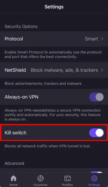 Note:When this feature is active on iOS/iPadOS, you may lose the ability to access other devices on your local Wi-Fi network (such as network printers, smart speakers, or local servers), as the Kill Switch prevents all traffic from leaving the device unless it is routed through the VPN tunnel.